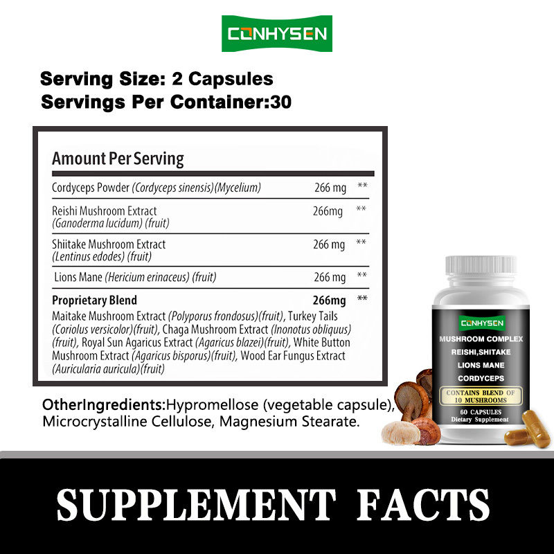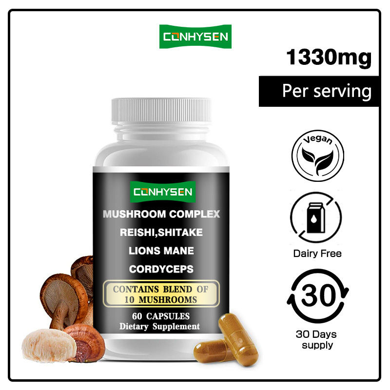 Étiquette privée Champignon complexe Capsules Renforce l' Immunité Santé intestinale Énergie 10 Champignons