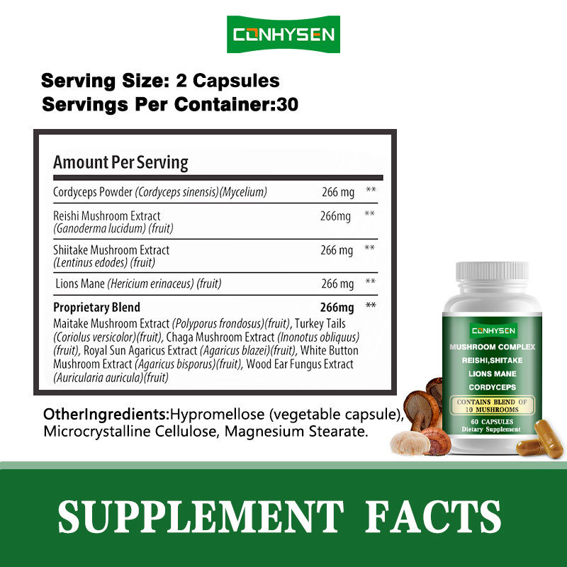 | Ingrédient principal | Poudre de Cordyceps, extrait de champignon Reishi, extrait de champignon Shiitake, Crinière de lion | ||