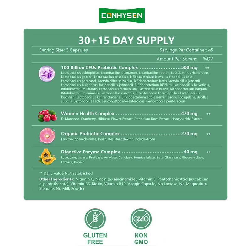 Ingrédient principal | CFU Probiotique, complexe de santé féminine, prébiotiques, enzymes digestives |