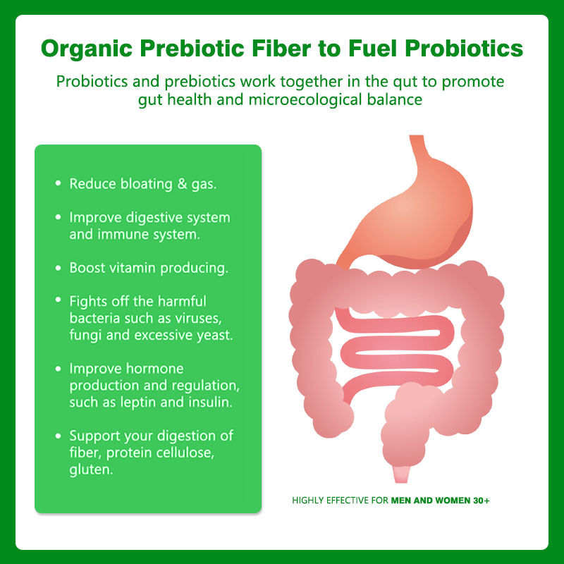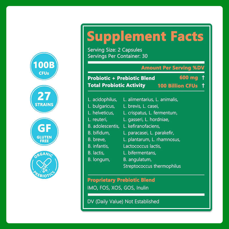Probiotiques et prébiotiques en capsules est un complément alimentaire innovant conçu spécifiquement pour améliorer la santé intestinale.combinant parfaitement des probiotiques actifs avec des prébiotiques de haute qualité pour créer un effet synergiqueChaque capsule contient des milliards de probiotiques actifs.y compris les souches cliniquement vérifiées telles que Bifidobacterium et LactobacillusCes bactéries bénéfiques peuvent inhiber la croissance des bactéries nocives, favoriser l'absorption des nutriments et renforcer l'immunité.