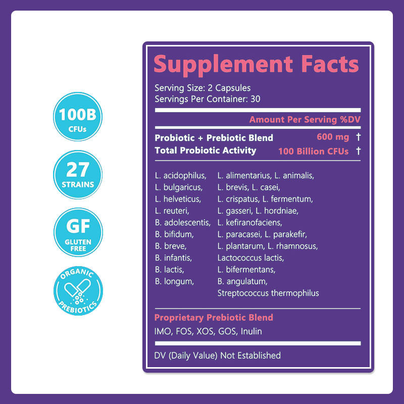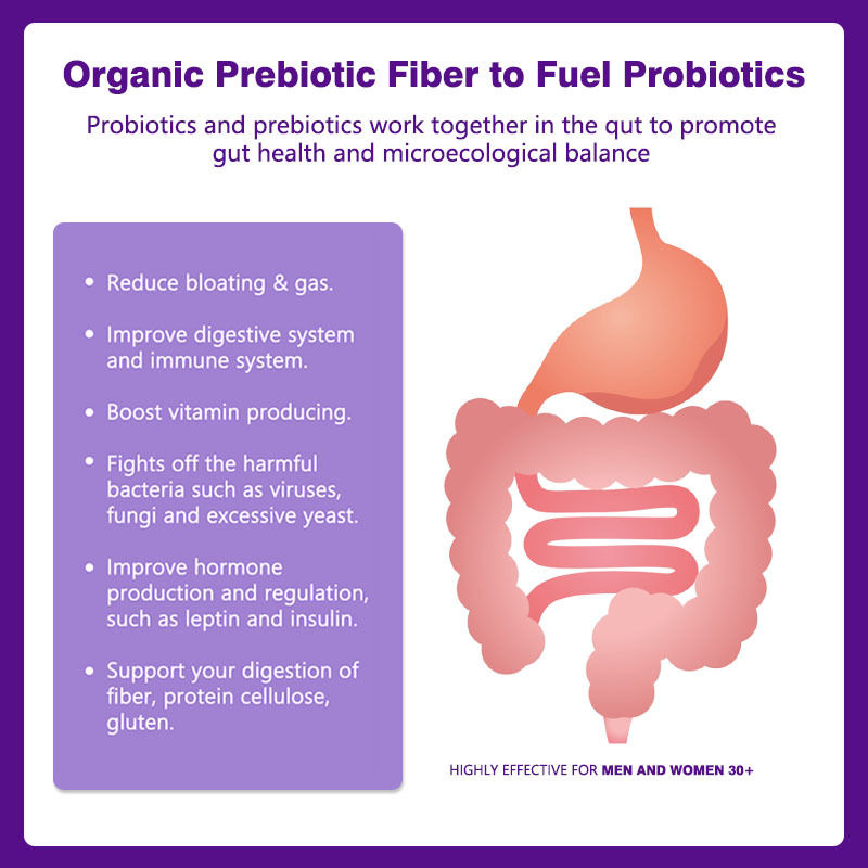 Probiotic Prebiotic Capsules are a cutting-edge dietary supplement designed to support and improve intestinal health by integrating the dual benefits of probiotics and prebiotics into a convenient capsuleCette puissante formule à double effet fonctionne en synergie pour favoriser l'équilibre microbien, améliorer la fonction digestive, stimuler l'immunité et contribuer au bien-être général.Chaque capsule contient des milliards de probiotiques actifs (comme les lactobacilles et les bifidobactéries) dérivés de souches de recherche clinique, ainsi que des fibres prébiotiques de haute qualité qui nourrissent ces bactéries bénéfiques.