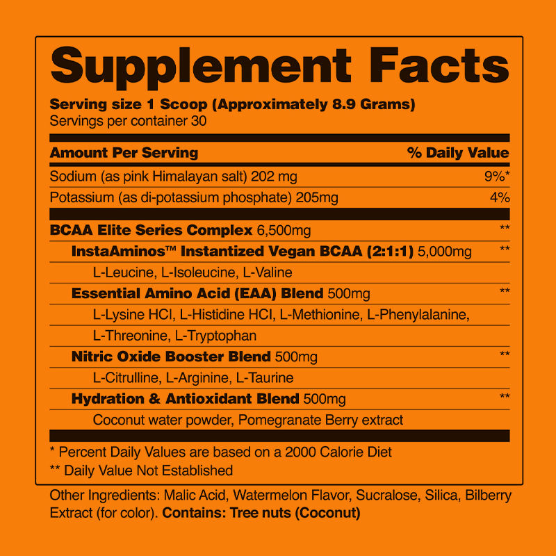 Ingrédients:Sodium, potassium, complexe de la série BCAA Elite, BCAA végétalien instancié, mélange d'acides aminés essentiels, mélange d'oxyde nitrique, mélange d'hydratation et d'antioxydant