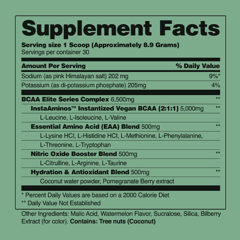 Ingrédients: Sodium, Potassium, Complexe BCAA Elite Series, BCAA végétalien instantané, Mélange d'acides aminés essentiels, Mélange de boosters d'oxyde nitrique, Mélange d'hydratation et d'antioxydants