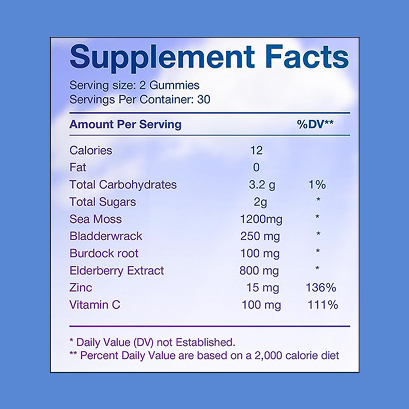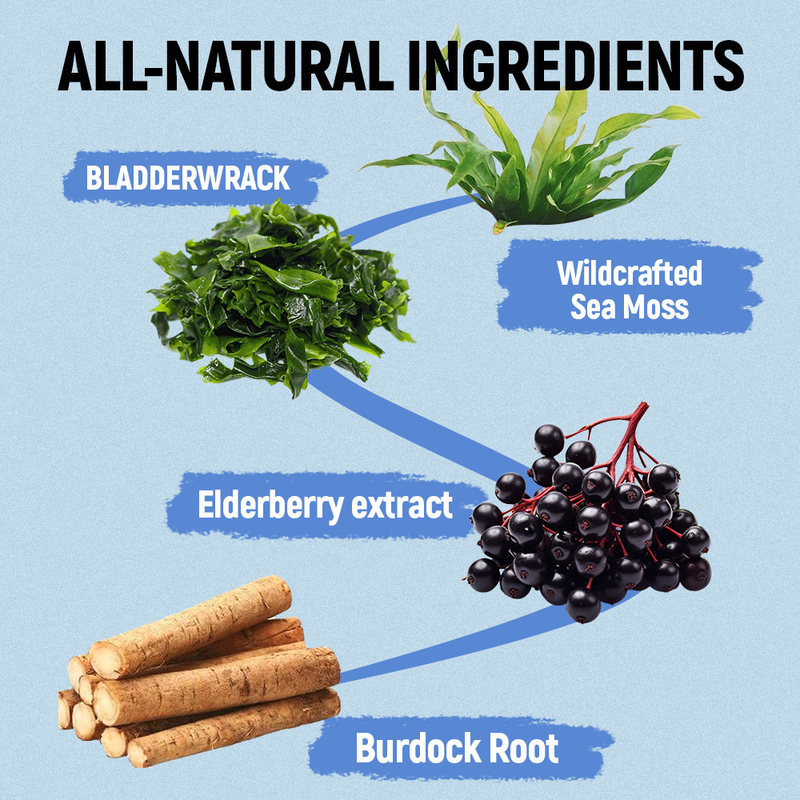 Mousse de mer, écorce de vésicule, racine de bardeaux, extrait de sureau, zinc, vitamine C