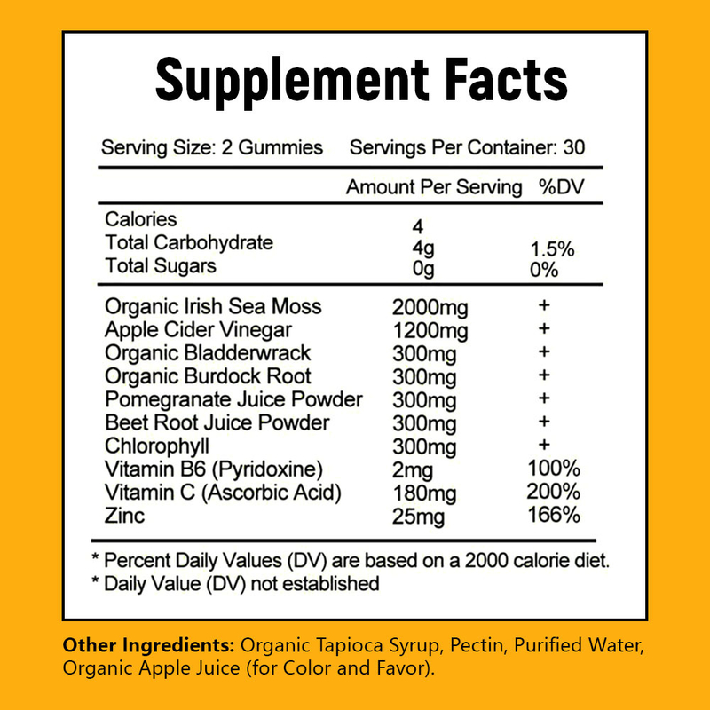 Mousse de mer d'Irlande biologique, éruption cutanée biologique, racine de bardeaux biologique, vinaigre de cidre de pomme, jus de grenade en poudre, jus de racine de betterave en poudre, zinc, vitamine B6, vitamine C, chlorophylle