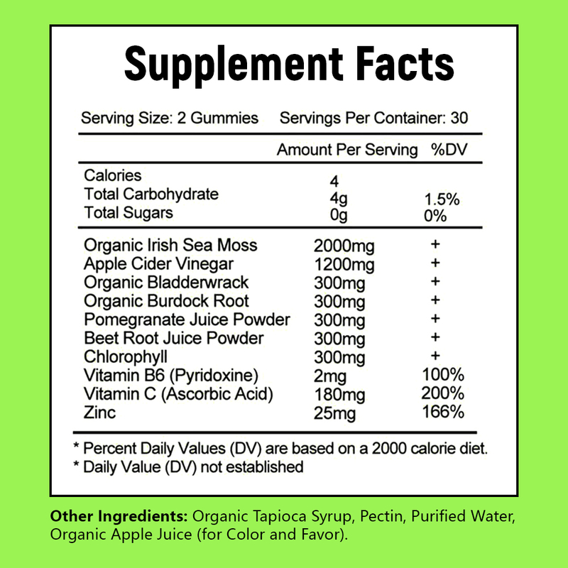 Mousse marine irlandaise biologique, varech biologique, racine de bardane biologique, vinaigre de cidre de pomme, poudre de jus de grenade, poudre de jus de betterave, zinc, vitamine B6, vitamine C, chlorophylle