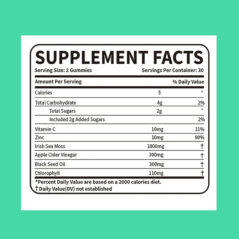 Mousse de mer d'Irlande, vinaigre de cidre de pomme, zinc, vitamine C, chlorophylle, huile de graines noires