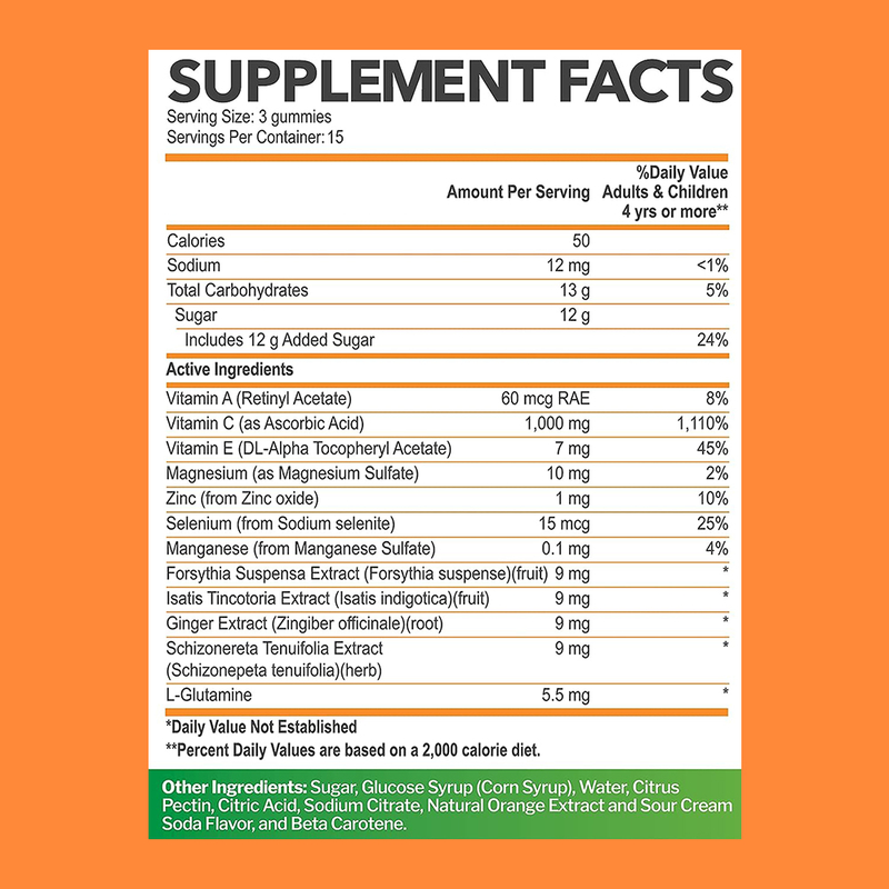 Vitamine C, Vitamine A, Vitamine E, Zinc, Magnésium, Sélénium, Manganèse, Extrait de gingembre, Extrait de Forsythia Suspensa, Extrait d'Isatis Tincotoria, Extrait de Schizonereta Tenuifolia, L-Glutamine