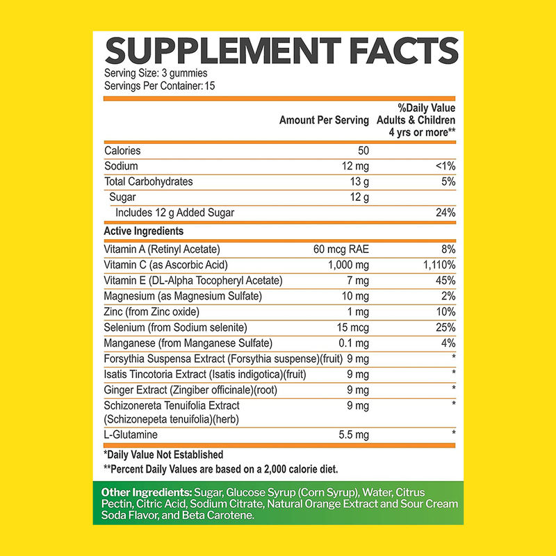Vitamine C, vitamine A, vitamine E, zinc, magnésium, sélénium, manganèse, extrait de gingembre, extrait de Forsythia Suspensa, extrait d' Isatis Tincotoria, extrait de Schizonereta Tenuifolia, L-glutamine
