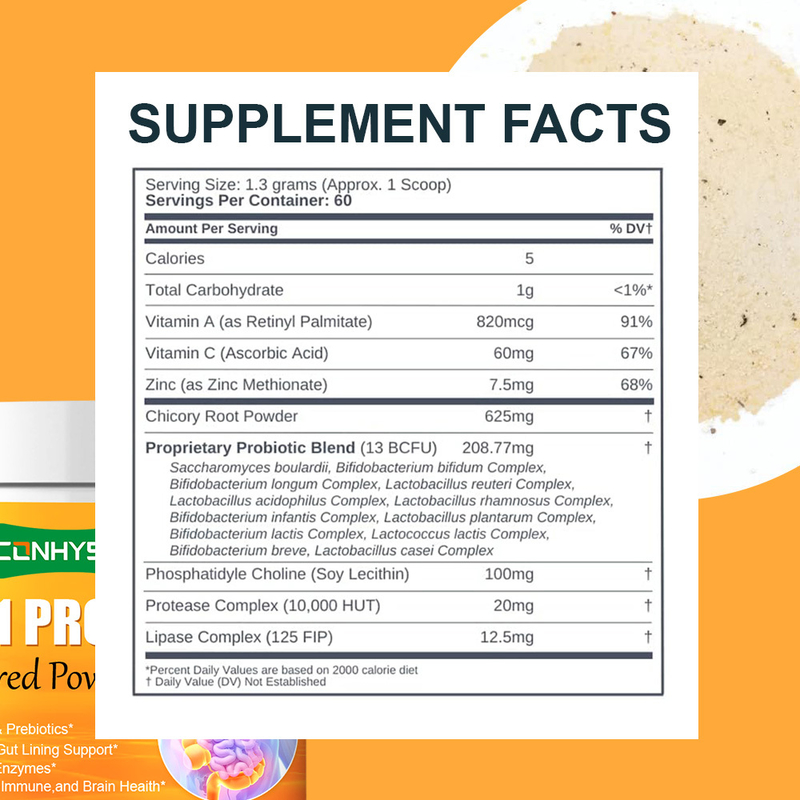 Vitamine A, vitamine C, zinc, poudre de racine de chicorée, mélange probiotique exclusif, choline phosphatidyle, complexe de protéases, complexe de lipases