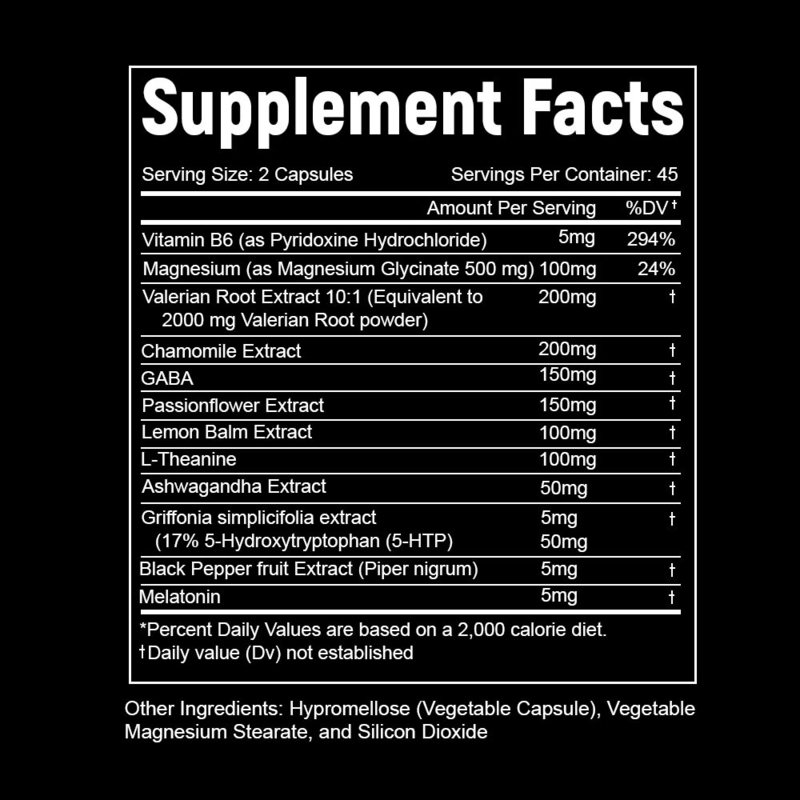 La vitamine B6, le magnésium, l'extrait de racine de valériane, l'extrait de camomille, le GABA, l'extrait de passionflower, l'extrait de citron, la L-théanine, l'extrait d'ashwagandha, l'extrait de Griffonia simplicifolia,Extrait de poivre noir, mélatonine