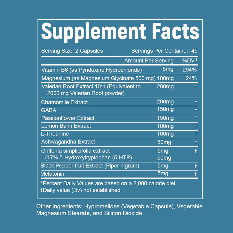Vitamine B6, Magnésium, Extrait de racine de valériane, Extrait de camomille, GABA, Extrait de passiflore, Extrait de mélisse, L-Théanine, Extrait d'ashwagandha, Extrait de Griffonia Simplicifolia, Extrait de fruit de poivre noir, Mélatonine