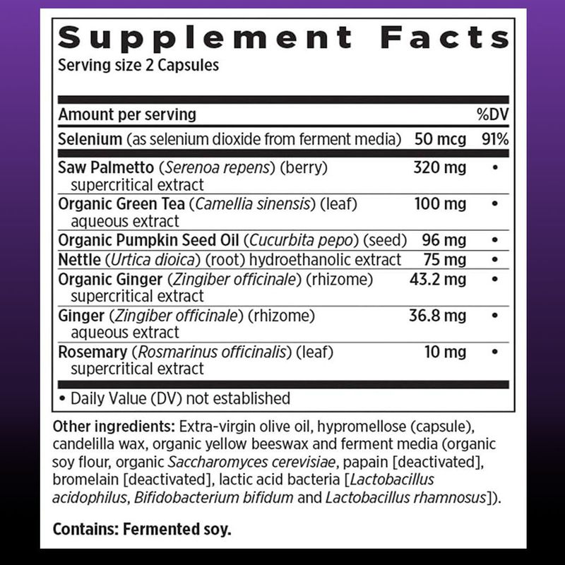 Sélénium, Saw Palmetto, Thé Vert Biologique, Huile de Graines de Citrouille Biologique, Ortie, Gingembre Biologique, Gingembre, Romarin