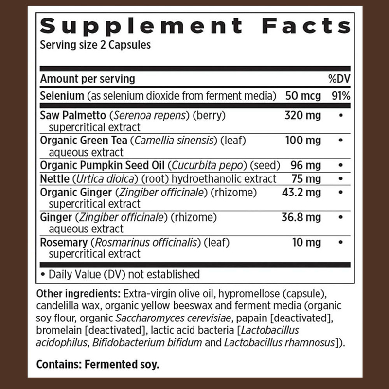 Sélénium, Saw Palmetto, Thé vert biologique, Huile de graines de citrouille biologique, Ortie, Gingembre biologique, Gingembre, Romarin